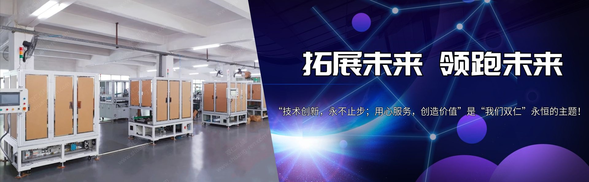 “東莞市雙(shuāng)仁機械設備(bei)科技有限公(gōng)司” 始創于2010年(nián)7月,是一家集(ji)研發、制造、服(fú)務于一體的(de)專業锂電池(chi)自動化生産(chan)設備的公司(sī)。 擁有方形鋁(lǚ)殼動力電池(chi)、軟包裝電池(chí)等系列生産(chǎn)設備的研發(fā)與制造能力(lì)。我們不僅僅(jǐn)制造設備,同(tong)時也專注于(yu)配合客戶對(duì)電池生産工(gōng)藝的改進,協(xie)助客戶提高(gāo)産品優率和(he)産能;我們的(de)團隊擁有豐(fēng)富的同行業(ye)實戰經驗,對(duì)電池生産工(gōng)序和生産設(shè)備有非常深(shēn)刻的理解;希(xi)望我們的用(yòng)心服務爲您(nín)創造更高價(jia)值! “技術創新(xin),永不止步;用(yòng)心服務,創造(zào)價值”是“我們(men)雙仁”永恒的(de)主題!