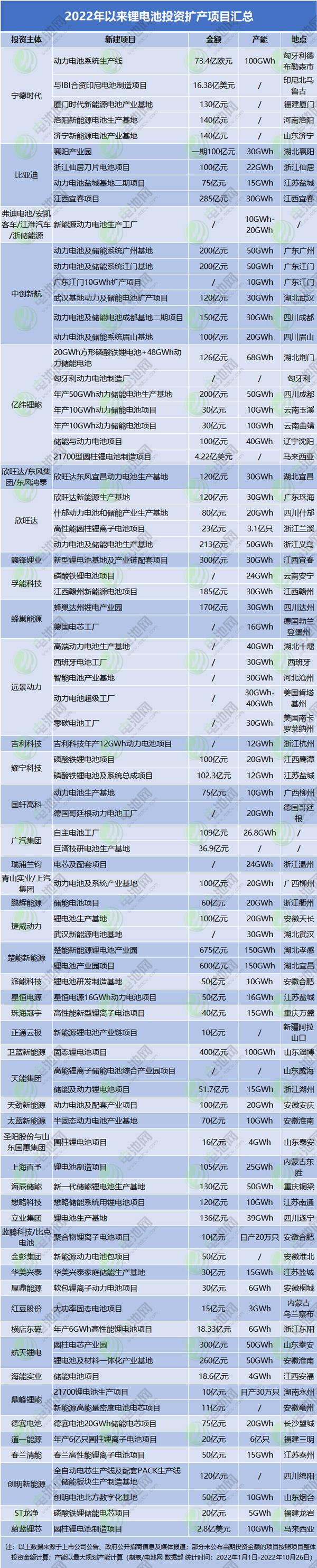 12月(yuè)1日電池網公(gōng)布的數據顯(xian)示,據不完全(quan)統計,2022年以來(lai),僅在锂電池(chí)生産制造領(lǐng)域,新公布的(de)投資擴産項(xiang)目就多達84個(gè),其中有69個公(gong)布投資金額(é),總金額超8427億(yì)元,平均單個(ge)項目投資額(e)超122億元;公布(bù)年産能的項(xiàng)目有68個,總産(chǎn)能約2038GWh。